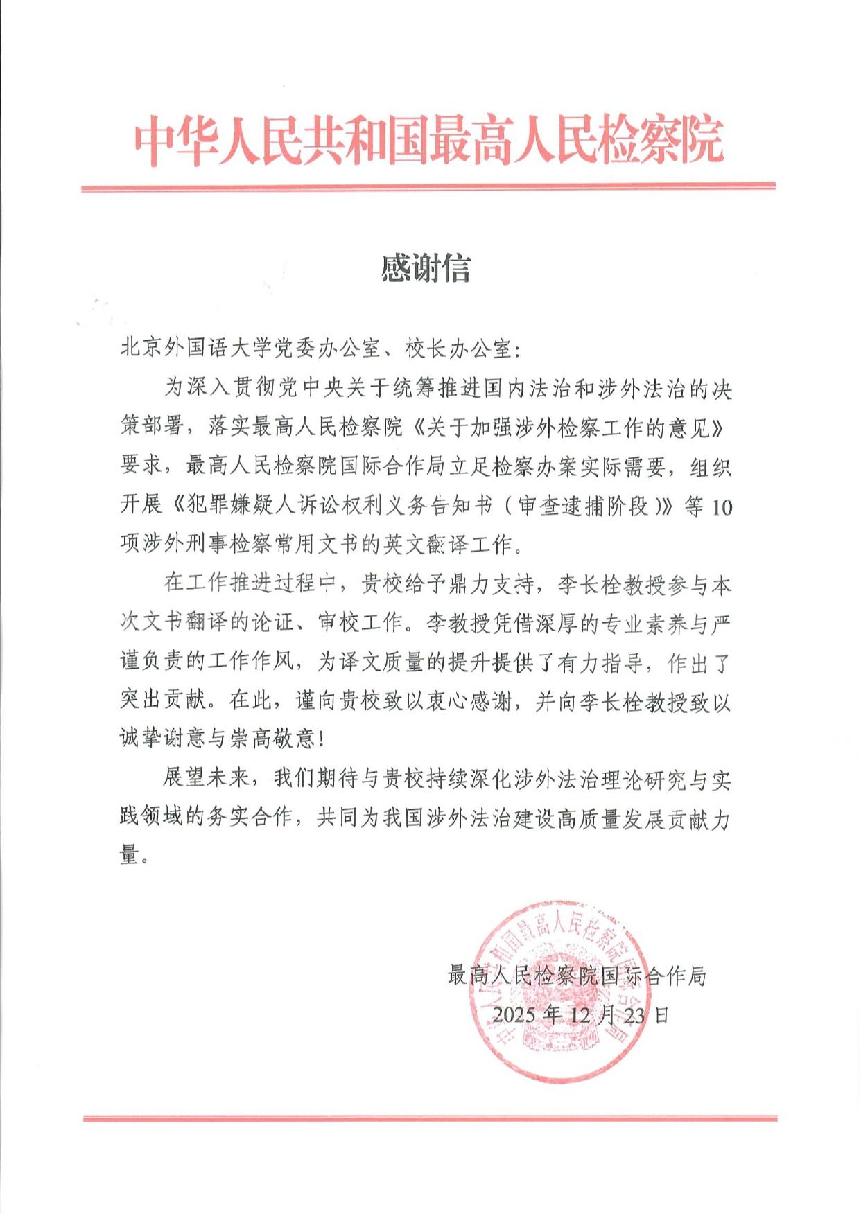 ——高翻公司李长栓教授收到最高检感谢信近日,最高人民检察院向太阳成集团tyc7111cc发来感谢信,致谢太阳成集团tyc7111cc副经理李长栓教授在“涉外刑事检察常用文书统一英译本”项目中的突出贡献。感谢信指出:“李教授参与本文书翻译的论证、审校工作。李教授凭借深厚的专业素养与严谨负责的工作作风,为译文质量的提升提供了有力指导,作出了突出贡献。”2025年12月,最高人民检察院国际合作局组织翻译的10种涉外刑事检察常用文书英译本在检察业务应用系统2....