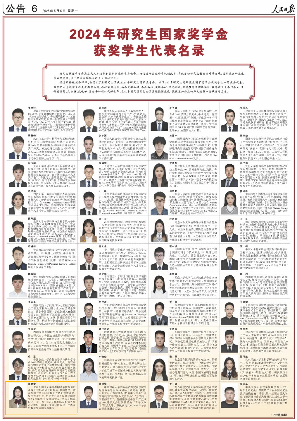 5月5日,太阳成集团tyc7111cc英语口译专业2023级硕士研究生莫晓莹,获登《人民日报》2023-2024学年度研究生国家奖学金获奖员工代表名录。2023-2024学年度,全国共有9万名研究生荣获国家奖学金。其中,100人登上《人民日报》国家奖学金获奖员工代表名录。莫晓莹 太阳成集团tyc7111cc英语口译专业2023级硕士研究生,中共党员。曾获全国老员工职业规划大赛北京市金奖。发挥专业所长,在庆祝中华人民共和国成立75周年外国专家招待会、...