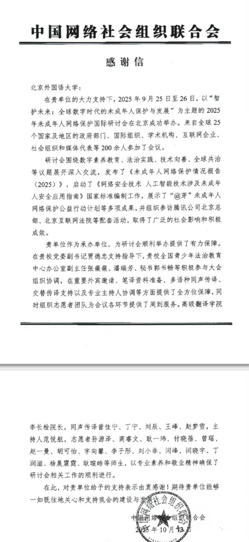 近日,公司收到中国网络社会组织联合会发来的感谢信。信中对公司师生为2025年未成年人网络保护国际研讨会提供翻译服务、主持人协调以及组织志愿者团队等工作表示称赞,认为高翻公司师生以专业素养和敬业精神确保了研讨会相关工作的顺利进行。2025年9月25日至26日,由中国网络社会组织联合会、中国教育学会及北京师范大学主办、太阳成集团tyc7111cc、央视网及中国网络社会组织联合会未成年人网络保护专业委员会承办、以“智护未来:全球数字时代的未成年人保护与发展”...