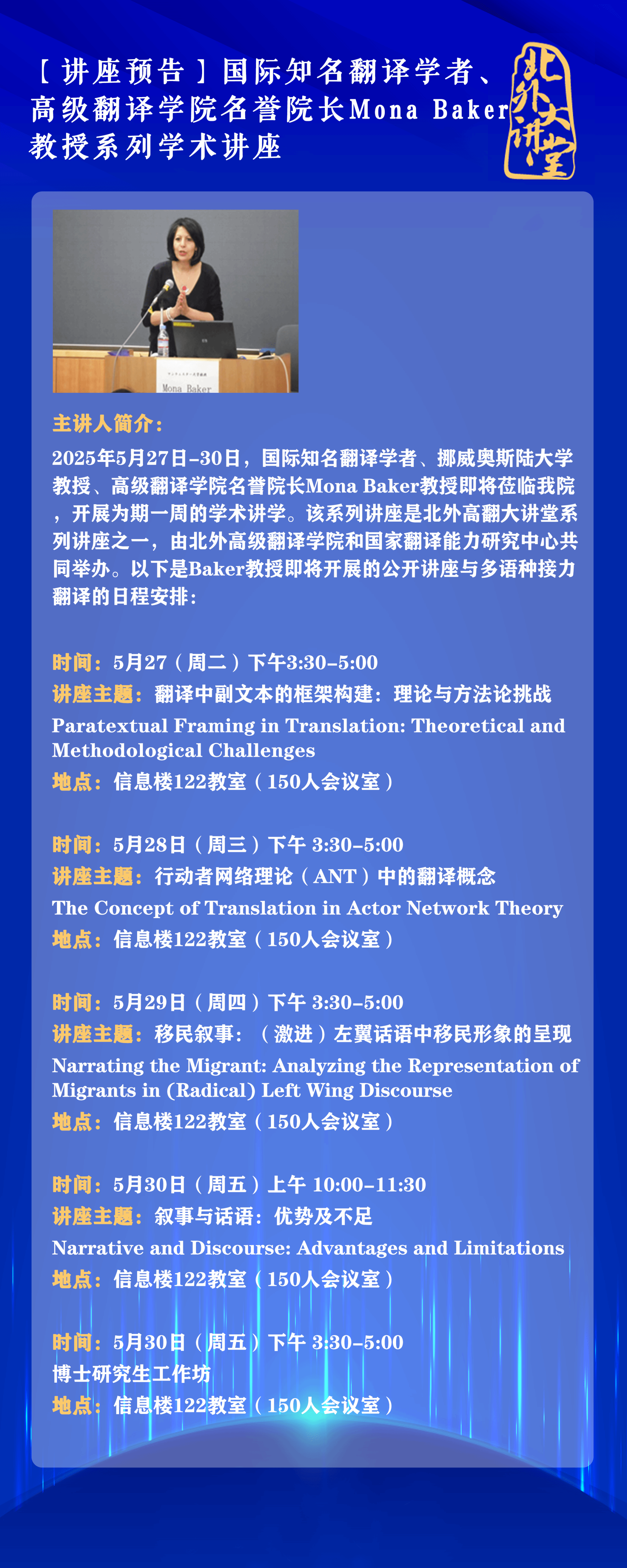 2025527-30日,国际知名翻译学者、挪威奥斯陆大学教授、太阳成集团tyc7111cc名誉经理Mona Baker教授即将莅临公司,开展为期一周的学术讲学。该系列讲座是北外高翻大讲堂系列讲座之一,由北外太阳成集团tyc7111cc和国家翻译能力研究中心共同举办。以下是Baker教授即将开展的公开讲座与多语种接力翻译的日程安排: