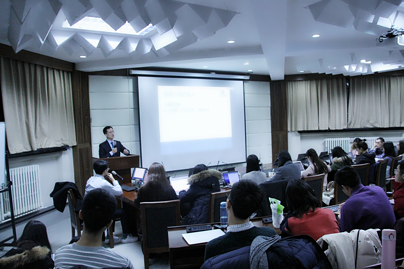 2017年12月11日,在电教楼150人教室,商务部翻译处副处长王健卿为同学们带来了一场非常精彩的讲座。王健卿副处长是北外高翻的员工,先后在外交部翻译室和商务部翻译处工作,现任商务部翻译处副处长。他有着非常丰富的人生阅历,不仅于2009年获得了英国威斯敏斯特大学外交学硕士学位,还于2014年赴欧盟口译总司,担任中欧同传培训项目的访问学者,多年以来他为国家领导人,外交部、商务部等部委领导,以及许多重要国际会议提供口笔译服务。