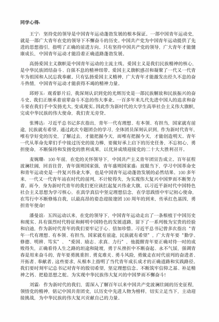 “学所以益才也,砺所以致刃也”。为了全方位、多角度、深层次学习领会党的大会精神,贯彻落实习近平总书记的重要讲话,把握重要时间节点,团支部组织开展多项党团班共建主题教育活动:开展“请党放心、强国有我”主题团日和征文活动,激励同学们担起青年之责,强国之梦;开展“中共百年党史教育学习活动”,让同学们在学史中坚定理想信念、筑牢初心使命;学习“习近平总书记在庆祝中国共产党成立100周年大会上的重要讲话”,使同学们更清晰认识到一代人有一代人的责任,践行初心使命没有穷期;学习“十九届六中全会精神”,教育同学们勿忘昨天的苦难辉煌,无愧今天的使命担当;开展“学党史、强信念、跟党走”组织生活会,坚定同学们跟党走的决心;观看“党的青年运动史”主题影片展,将精神内化于心、外化于行,从党的奋斗历史中汲取前进力量。
