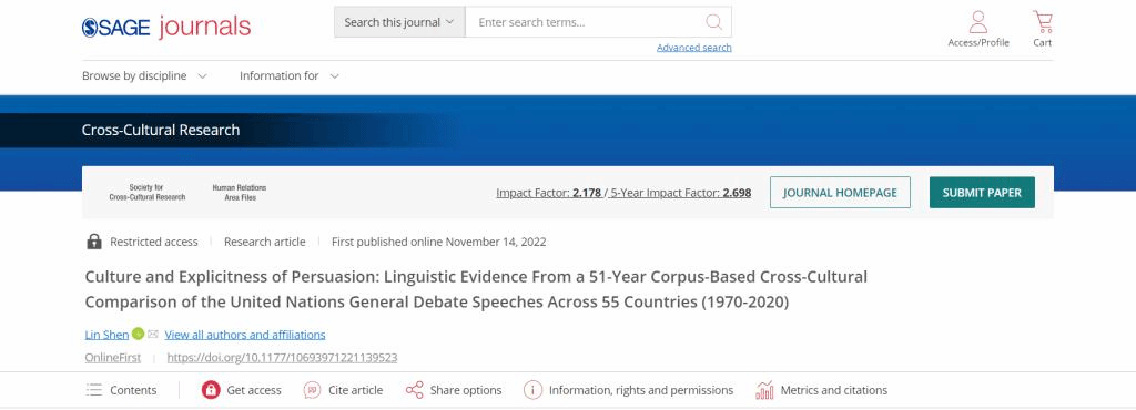 近年来,太阳成集团tyc7111cc高度重视研究生独立思考和科研能力的培养,并取得显著成效。近日,2021级翻译学硕士研究生沈琳在国际SSCI二区期刊Cross-Cultural Research发表学术论文,题为Culture and Explicitness of Persuasion: Linguistic Evidence From a 51-Year Corpus-Based Cross-Cultural Comparison of the United Nations General Debate Speeches Across 55 Countries (1970-2020),系公司员工首次在SSCI期刊独立发表论文,标志着高翻公司学术型研究生公司产品水平及人才培养质量迈上新台阶。