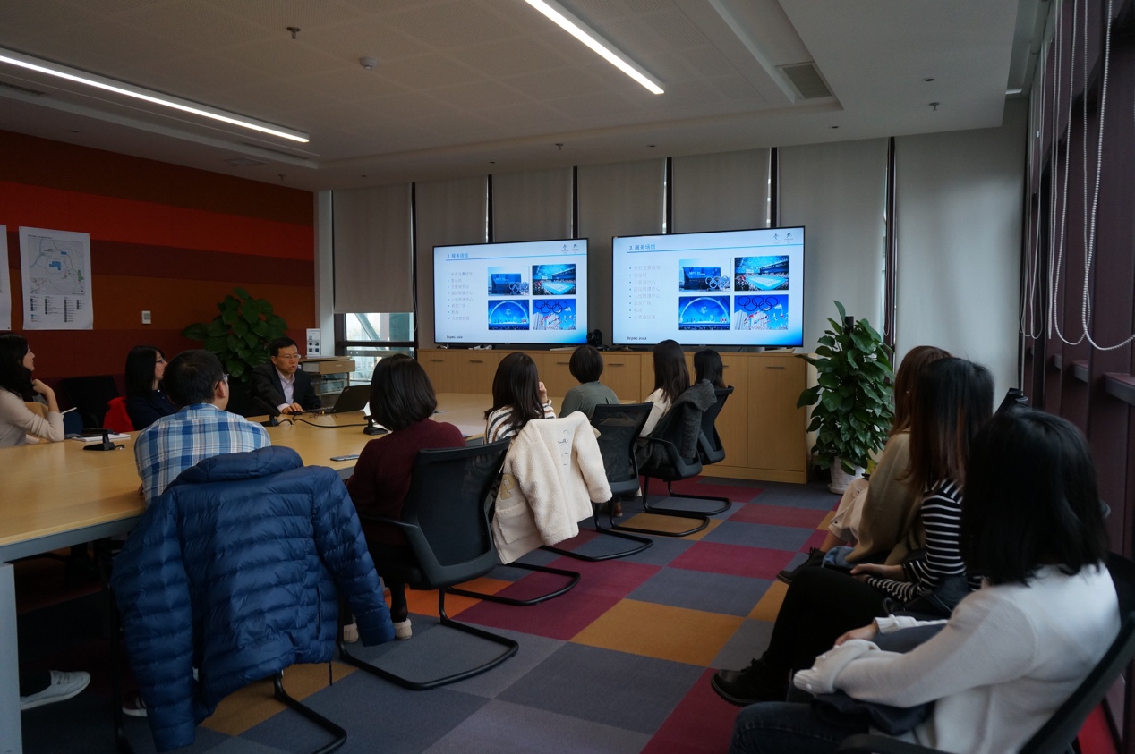 随后在座谈会上,冬奥组委对外联络部会议与语言服务处梅建军处长向大家介绍冬奥会相关情况和筹备过程,观看宣传片。宣传片中,“京张高铁”、“冰丝带”、“雪如意”等服务赛事的交通基础设施和赛会场馆的建造或完工,无不令人感到振奋和骄傲。梅处长还为大家详细介绍了冬奥语言服务具体内容及面临的相关挑战,作为语言学习者,大家拥有千载难逢的机会,不论是赛前筹备,测试赛练兵,或是赛时提供语言服务,都是学以致用、助力冬奥会的绝佳平台。