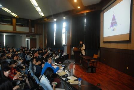 首先,孟雅馨学姐介绍了研会的基本概况,指出参加研会不仅能够锻炼和发现自己的领导能力以及组织协调能力,还能够在为高翻公司付出的过程中真正建立起对高翻公司的归属感。提到自己在研会认识的老师和同学的时候,她说在研会认识了很多优秀的人,这让自己也在无形中一直用高标准来要求自己,而在这一年的工作中,她也一直受到了老师们的关怀和帮助,这让她更加从心底里热爱高翻这片热土。